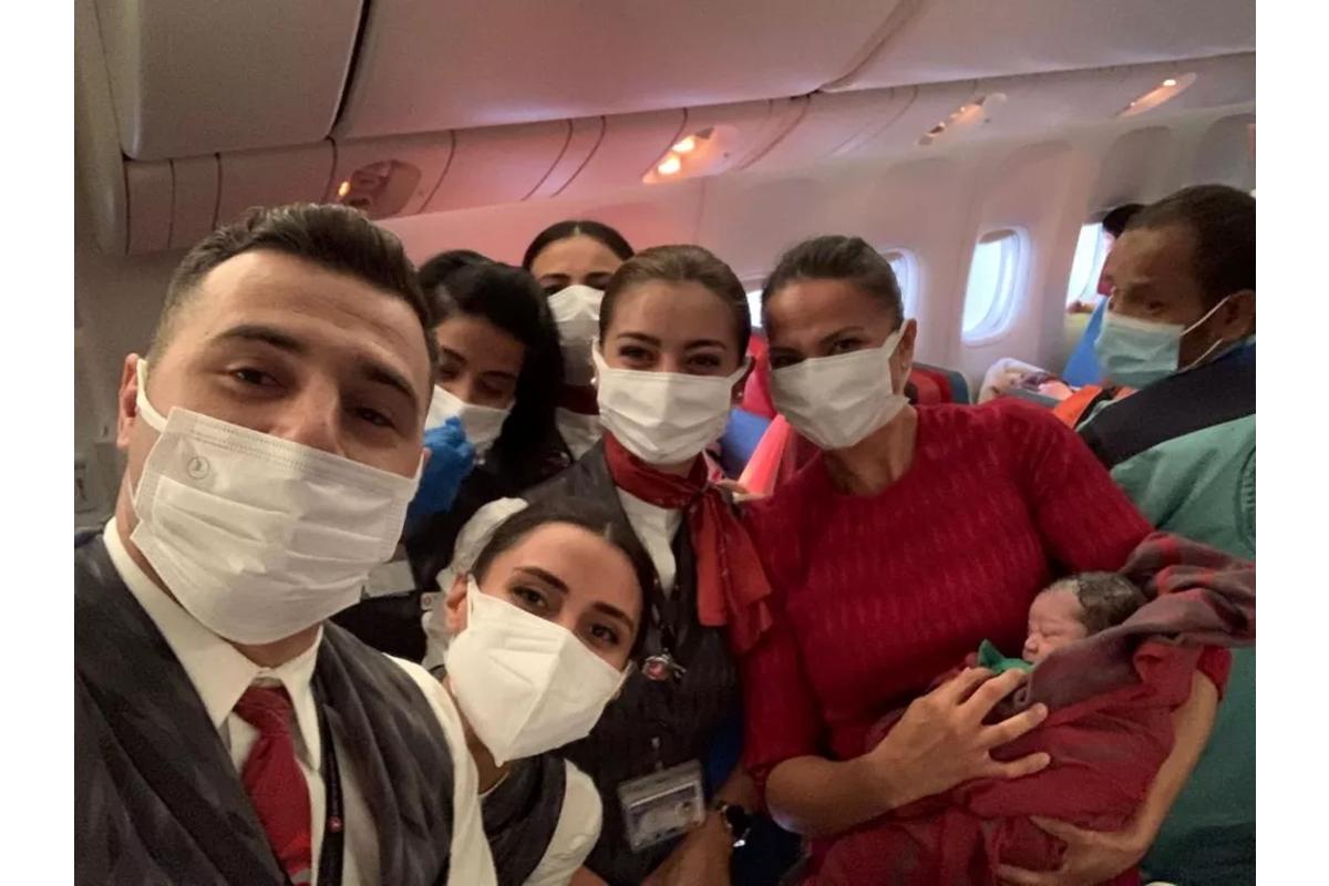Quem ajudou no parto, a 10 mil metros de altura, foram os membros da tripulação do voo da companhia aérea Turkish Airlines.