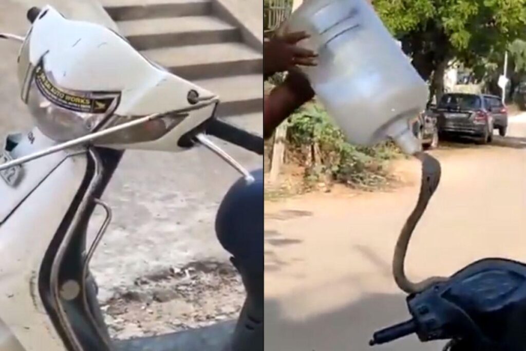 Passageira peculiar! Uma cobra foi encontrada no interior de uma moto na cidade de Hyderabad, Índia. O fato aconteceu em 2020, mas as imagens viralizaram novamente ontem nas redes sociais. No vídeo, a cobra estica seu corpo na parte frontal do veículo e é resgatada com o auxílio de um galão de água.