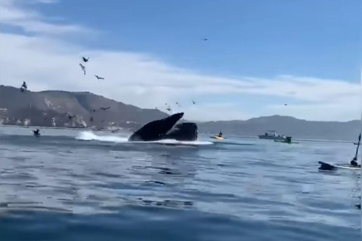 As amigas se empolgaram ao verem duas baleias que nadavam a cerca de 15 metros de distância delas. Elas remavam, junto a outros navegantes de caiaques, quando uma rede de iscas apareceu ao lado da dupla. Do nada, uma imagem que era de tranquilidade, assusta. Uma das baleias parte para cima do caiaque delas, já com a boca aberta.