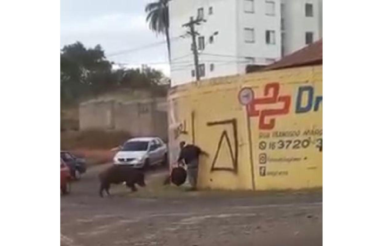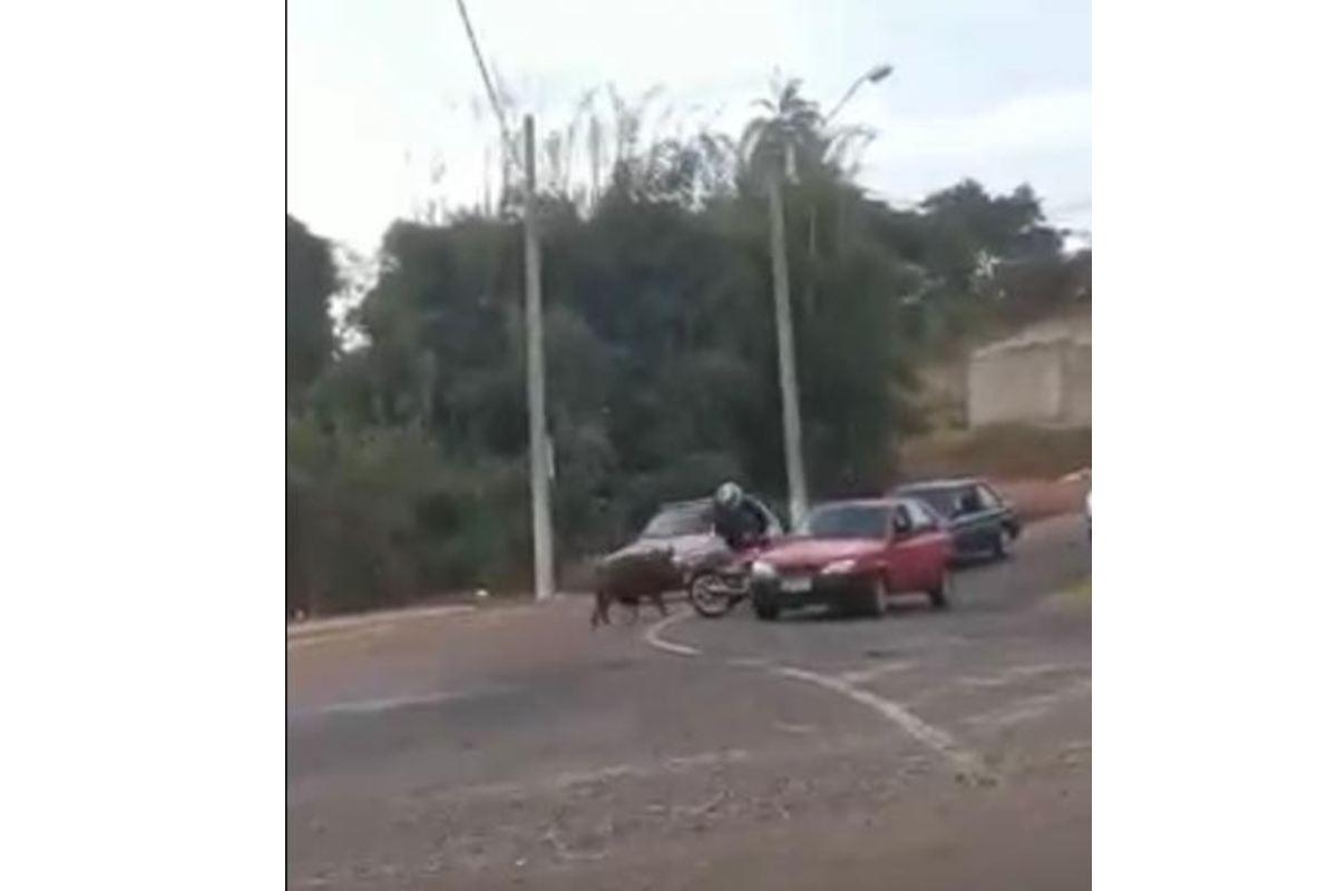 Nas imagens é possível ver a perseguição. Sem conseguir espantar o porco, o entregador levanta, deixa a moto, e corre do animal. Ele tenta se proteger usando a bolsa de entregas que levava nas costas, mas o porco avança e morde o motoboy.
