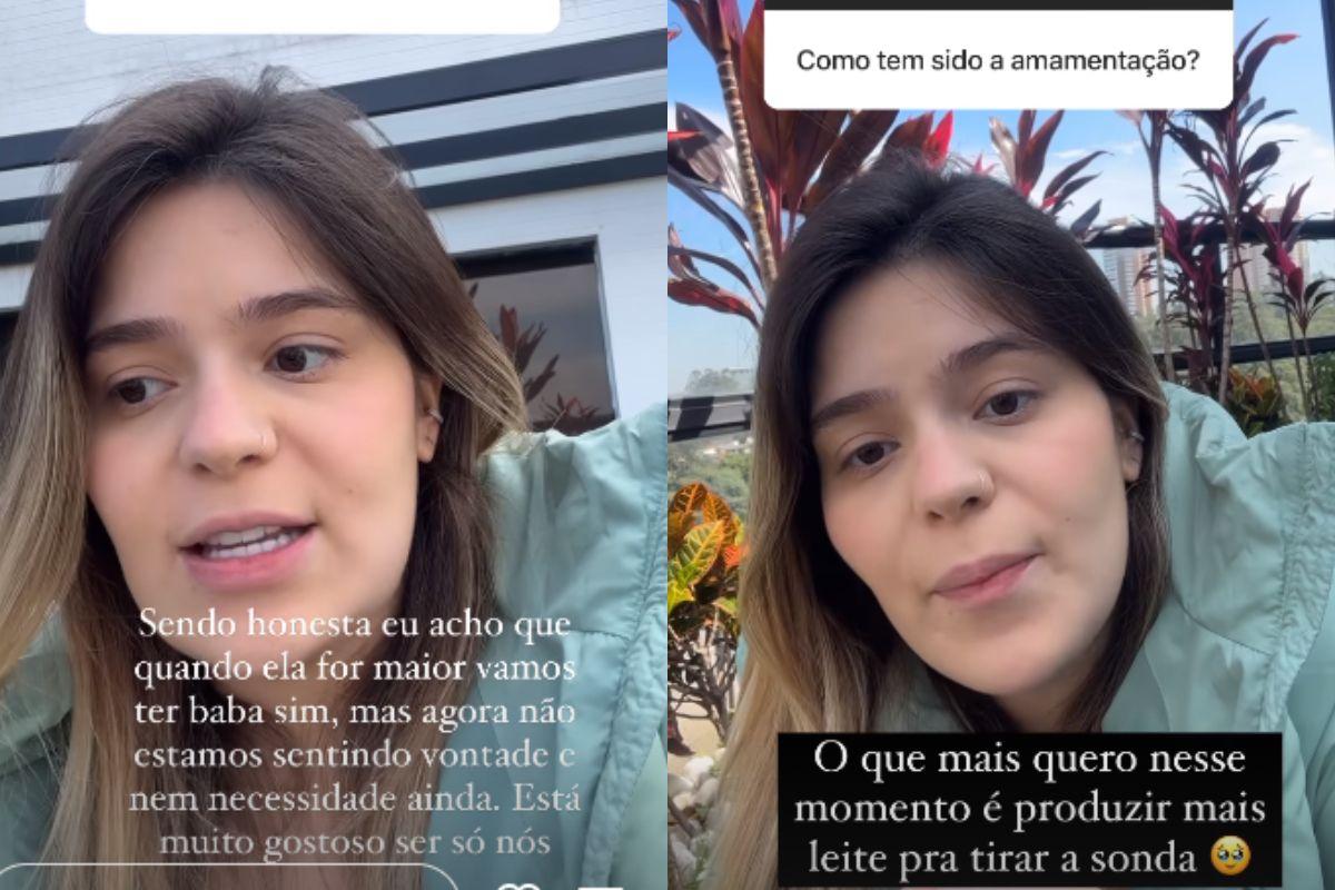 A mãe de primeira viagem disse que tem postado pouco da rotina porque sempre está amamentando, dormindo ou gravando. “Quem acompanha nossa vida, compensa mais ver os stories do Eli do que os meus. Ele posta tudo! Eu estou amamentando, dormindo ou gravando trabalho. Banho? Se eu já não gostava antes, agora, então…”.