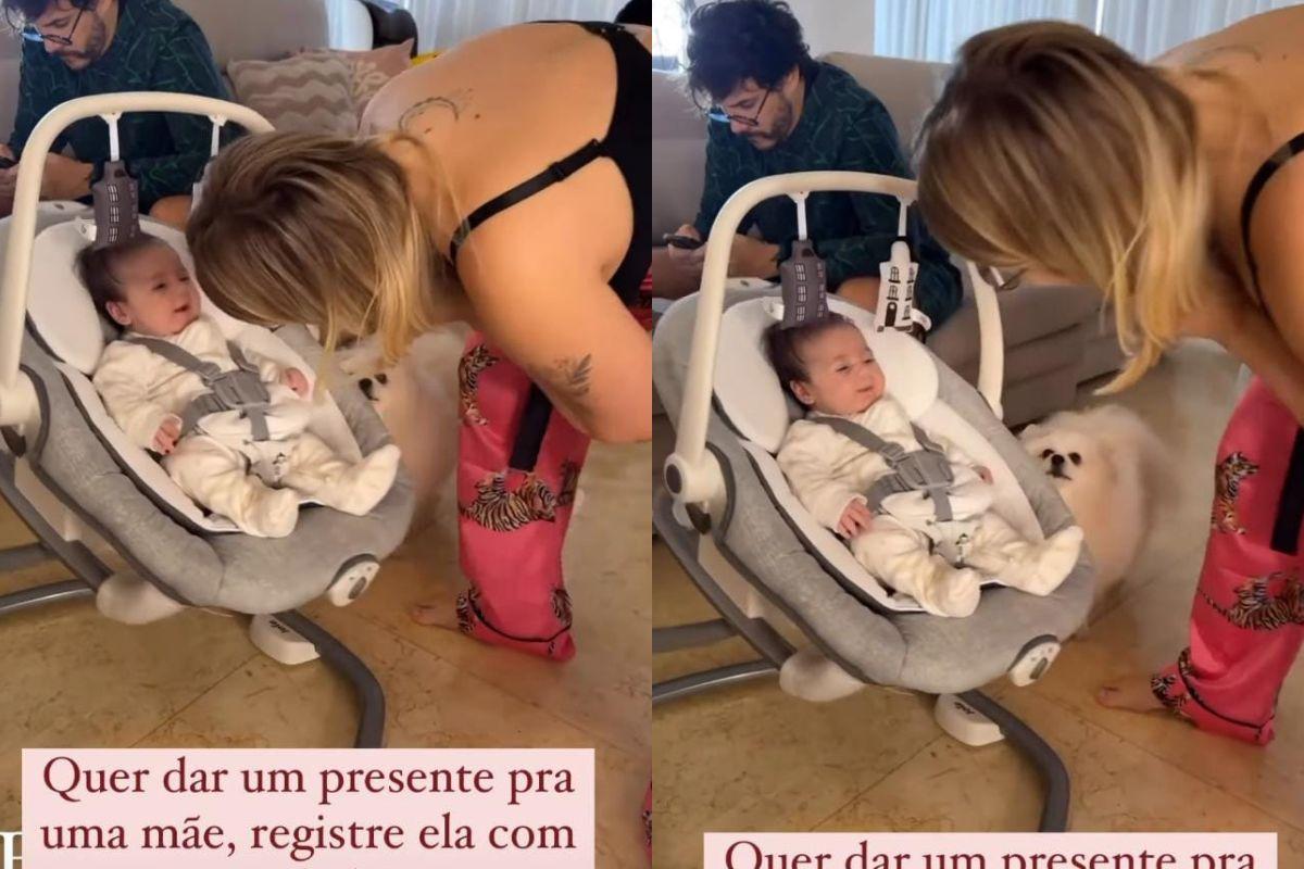 A filha do casal estava no balanço dela, colocado no chão, enquanto a mãe brincava com a mesma e Eliezer aparecia ao fundo, sentado no sofá. Uma terceira pessoa gravava Viih Tube brincando com Lua e a bebê sorrindo. Na legenda, a mãe de 22 anos de idade escreveu: “Quer dar um presente para uma mãe? Registre ela com o seu bebê”.
