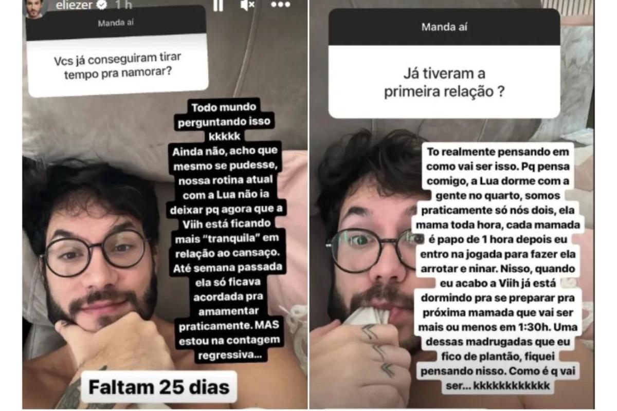 Eliezer revelou que ainda não aconteceu, pois estão se adaptando ao novo dia a dia com a filha Lua Di Felice, que dorme no quarto do casal e precisa ser alimentada constantemente. “A Lua dorme com a gente no quarto, somos praticamente só nós dois, ela mama toda hora, cada mamada é ‘papo’ de uma hora, e depois eu entro para fazer ela arrotar e ninar (…) Em uma dessas madrugadas que fiquei de plantão, pensei nisso, como vai ser”, conta.