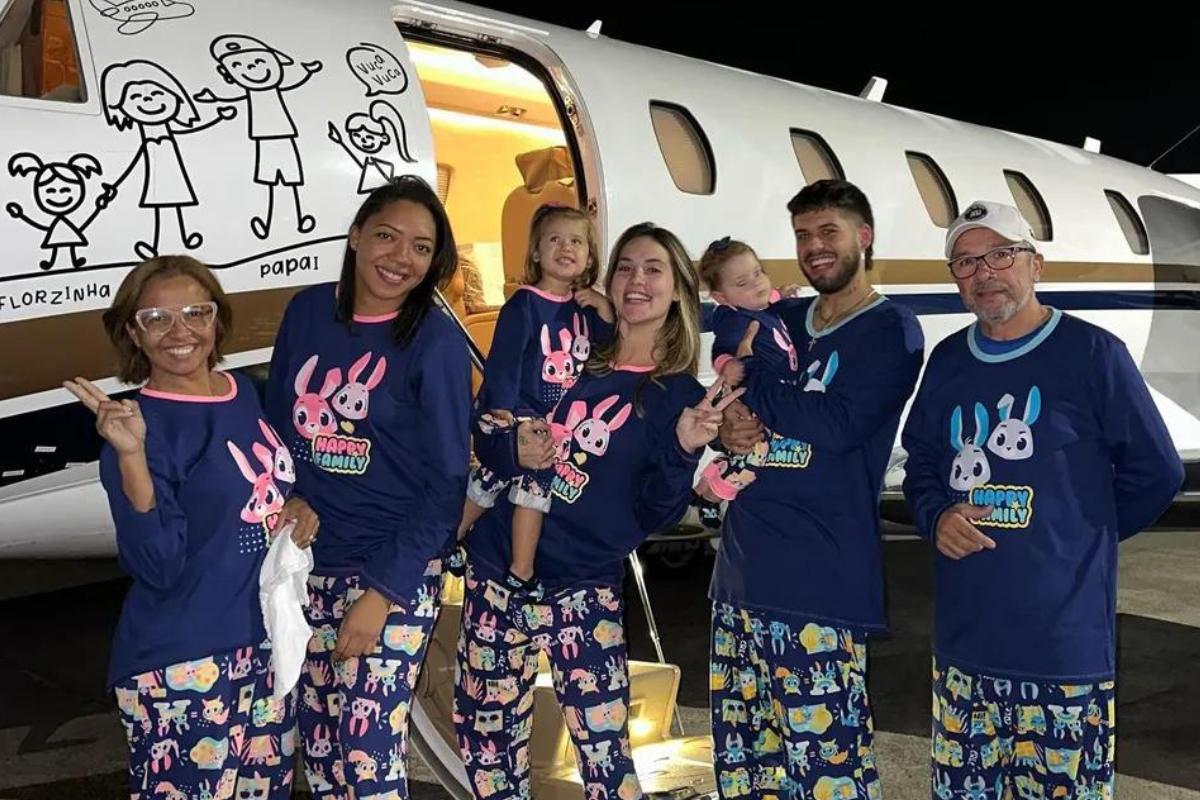 Compartilhando a emoção do momento, Virginia publicou em suas redes sociais uma foto ao lado de Zé Felipe e suas duas filhas, Maria Alice, prestes a completar 2 anos, e a pequena Maria Flor, de apenas 7 meses. Vestindo pijamas estampados combinando, eles esbanjaram estilo e descontração para o voo especial.