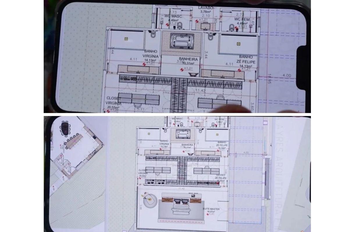 A casa vai ser dividida em vários ambientes, contando, claro, com um grande quarto para o casal. Virginia e Zé Felipe vão ter closet separados. Os banheiros também serão individuais, mas interligados por uma banheira de hidromassagem. O local poderá ser acessado pela conexão com a casa, através de um corredor, ou então pela parte externa.