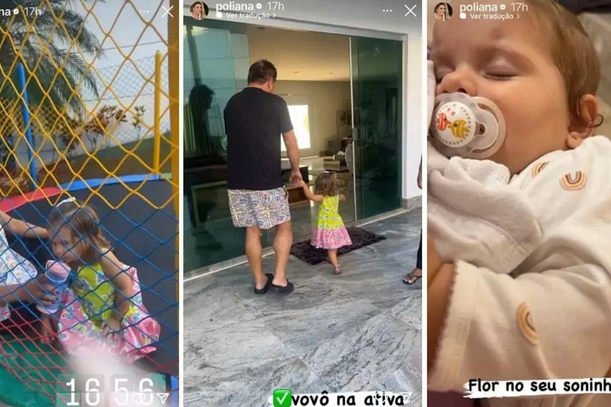 A jornalista Poliana Rocha usou as redes sociais para compartilhar novos registros de um momento especial. Na gravação, ela mostra o marido Leonardo, as netas Maria Flor, de 4 meses, e Maria Alice, de 1 anos, brincando com as babás na fazenda da família. O casal está tomando conta das filhas de Virginia e Zé Felipe, enquanto a influenciadora está trabalhando em Dubai.