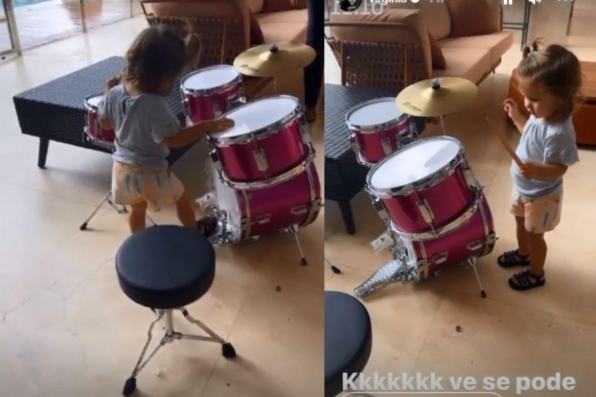 A influenciadora estava andando pela mansão quando filmou Alice ‘tocando’ bateria. Se divertindo bastante, a menina estava sorridente. “Isso mesmo, ela é maravilhosa. Ela é a nossa baterista”, brincou a mãe enquanto a menina se divertia com a bateria cor de rosa.