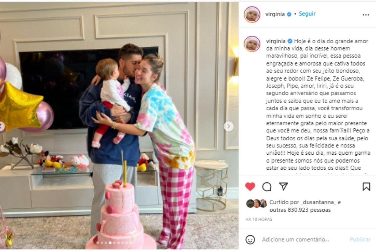 Por lá, Virginia escreveu: “Hoje é o dia do grande amor da minha vida, dia desse homem maravilhoso, pai incrível, essa pessoa engraçada e amorosa que cativa todos ao seu redor com seu jeito bondoso, alegre e bobo! Ze Felipe, Ze Gueroba, Joseph, Pipe, amor, liriri, já é o seu segundo aniversário que passamos juntos e saiba que eu te amo mais a cada dia que passa, você transformou minha vida em sonho e eu serei eternamente grata pelo maior presente que você me deu, nossa família!!!”.