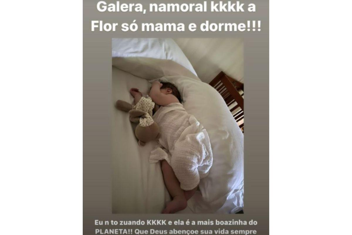 Neste sábado, Virginia falou sobre a filha mais nova, Maria Flor, alegando que ela é uma bebê muito calma e “boazinha”. A mãe de duas meninas contou que a menina dorme bastante: “A Flor só mama e dorme! Eu não estou zuando! Ela é a mais boazinha do planeta! Que Deus abençoe sua vida, Florzinha, você é a mais perfeitinha de mãe”.