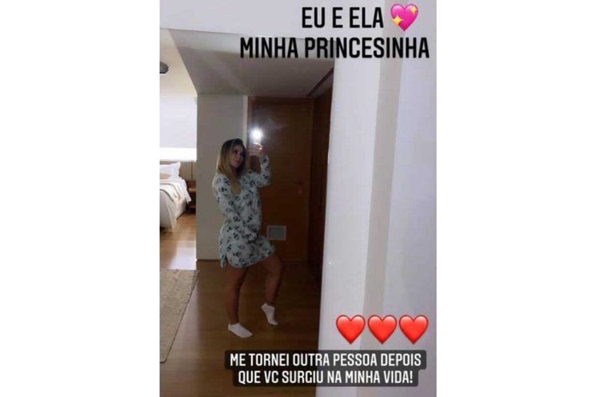 Nesta quinta-feira, 4 de fevereiro, a famosa usou as redes sociais para publicar uma foto no espelho. Na imagem, publicada nos Stories do Instagram, ela aparece usando uma camisola e meias. “Eu e ela! Minha princesa. Me tornei outra pessoa depois que você surgiu na minha vida”, declarou ela ao mostrar a imagem.