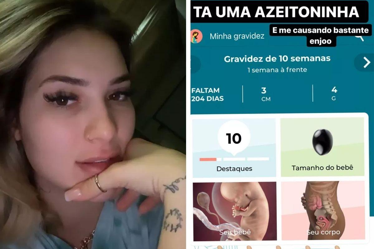 A mãe de primeira viagem está no primeiro tremeste da gestação. “Entrei na décima semana de gravidez. Vou mostrar para vocês como está o bebê agora”, disse ela, mostrando na sequência uma imagem sobre a evolução da gestação. “Está uma azeitoninha e me causando bastante enjôo”, contou.