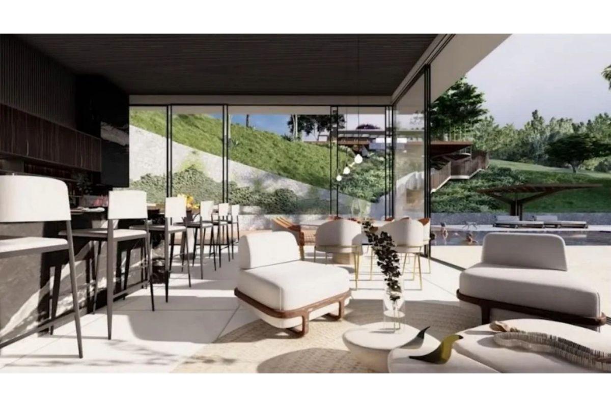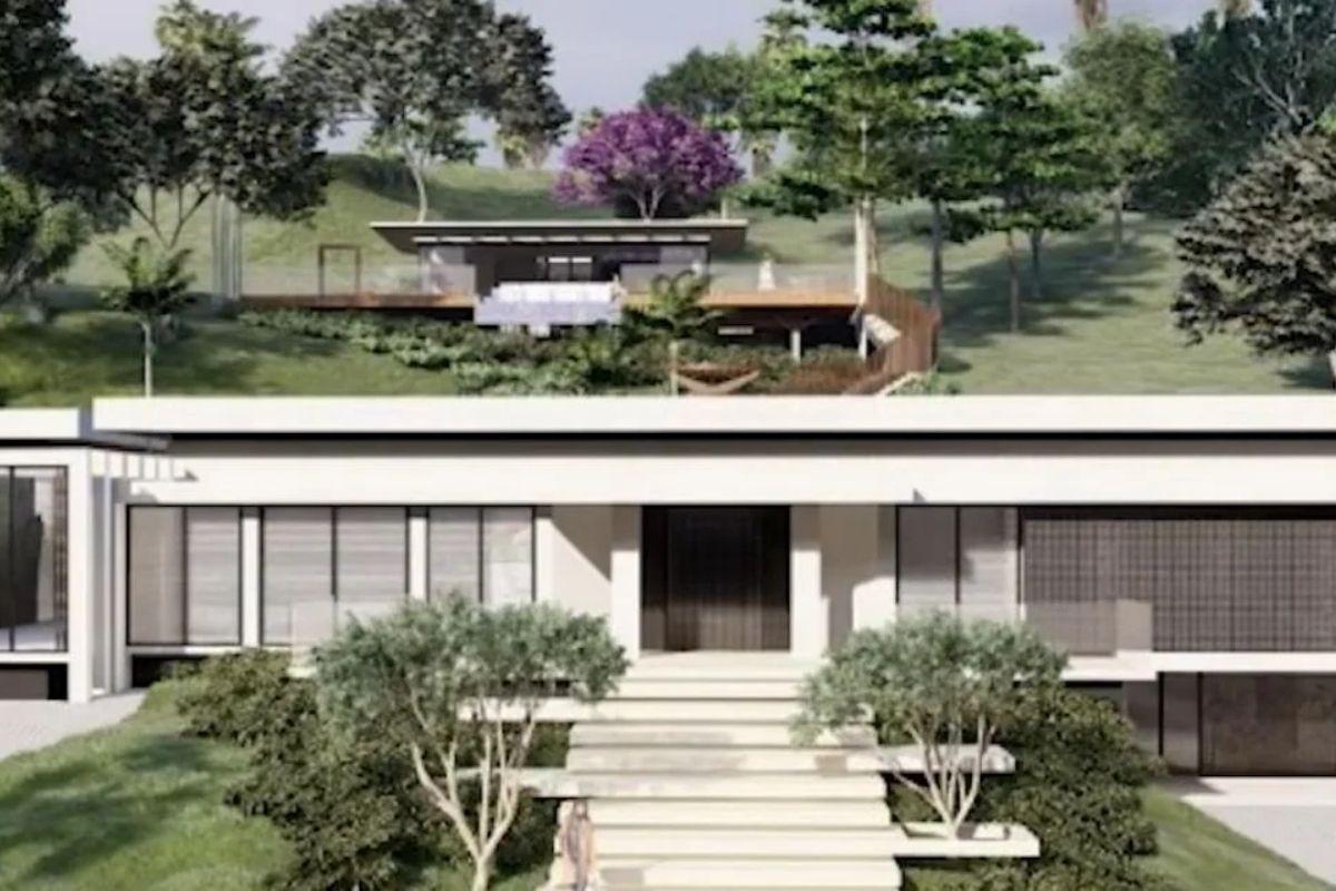 Pelos desníveis do terreno, dois outros ambientes se conectam através de uma escadaria, que ainda terá um espaço para as pessoas se sentarem. Na parte debaixo, ficam a entrada da casa, cozinha e salas de estar e jantar, com uma mesa de cerca de 10 lugares, além do quarto do casal. Os espaços foram pensados de uma forma mais “clean”, ou seja, sem muito detalhes ou itens de decoração.