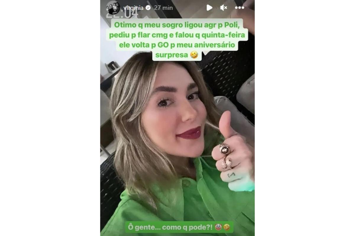 Nessa terça-feira, dia 4 de abril, ela postou uma selfie, em seu Instagram, fazendo o sinal “positivo” com o dedo polegar, de forma irônica, e contou o deslize do sertanejo. “Ótimo que meu sogro ligou agora para a Poli [Poliana, esposa dele], pediu para falar comigo e falou que quinta-feira volta para Goiás para o meu aniversário surpresa”, entregou. “Ô, gente, como que pode?”, completou ela.