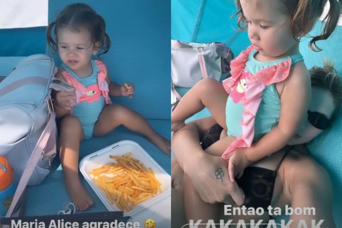Na sequência, ela mostrou Maria Alice comendo batata frita e curtindo o dia na praia. A menina aparece animada nos registros e aproveita para se aconchegar em cima da mãe. No final da tarde, Virginia apareceu ao lado da sogra, Poliana Rocha, e contou o quão divertido foi o dia.