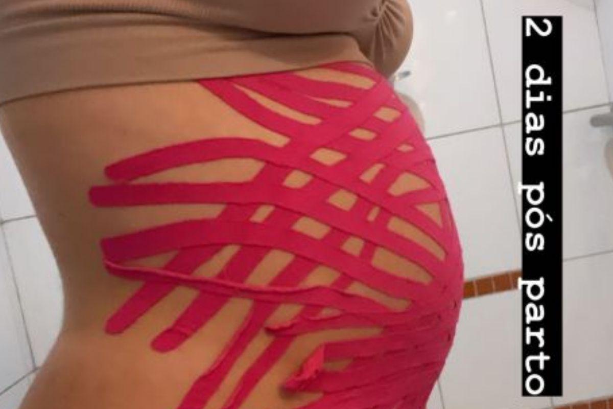 Com a barriga ainda inchada por causa da cesárea, Virgínia mostrou nos stories na terça-feira, 1º de junho, uma imagem em que aparece usando fitas adesivas de kinésio na região. O procedimento é utilizado para aliviar as tensões musculares e melhorar a circulação.