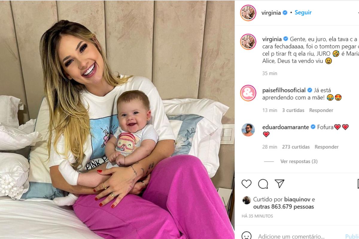 Virginia compartilhou ainda na legenda os detalhes da fotografia, e afirmou que antes do registro a menina não estava tão sorridente como depois de ver o celular se aproximando: “Gente, eu juro, ela tava com a cara fechadaaaa, foi o tomtom pegar o celular para tirar foto que ela riu, JURO é Maria Alice, Deus ta vendo viu”, brincou ela na publicação.