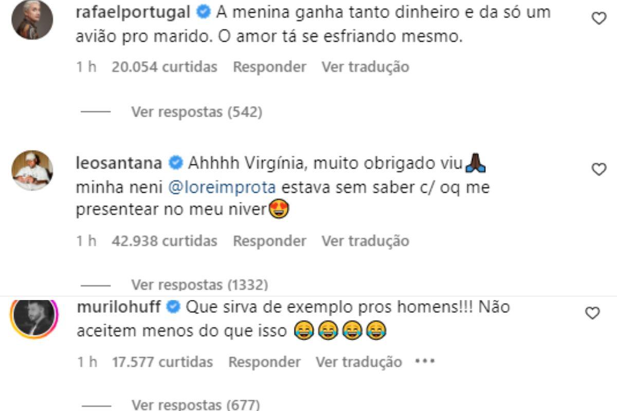 Em resposta ao post, que tinha escrito na legenda: “P*p ganhei um avião da minha gata!!! Agora dá pra levar a família todaaa, te amoo demais meu amor, esse avião é nosso!! Obrigado por tudo que você é, eu te amo e tô com você pra tudo te amoooooooo”, Léo Santana respondeu: “Ahhhh Virgínia, muito obrigado viu minha neni, Lore Importa, estava sem saber com  o que me presentear no meu niver”, brincou ele.