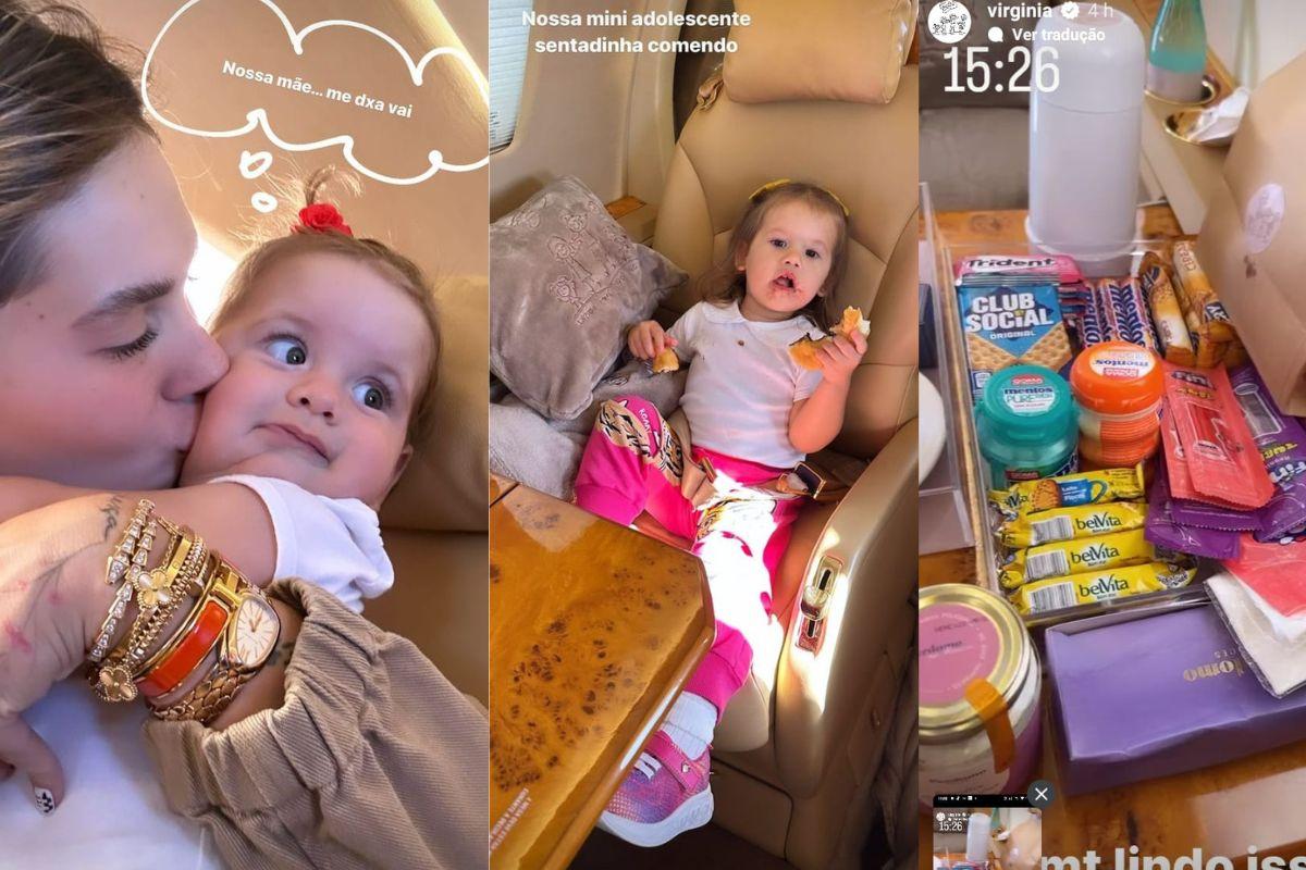 Ela ainda fez questão de compartilhar detalhes de como foi o voo em família em uma sequência de fotos com as filhas. Nos registros, é possível ver as meninas se divertindo durante a viagem e aproveitando as mais variadas comidas disponibilizadas no avião.