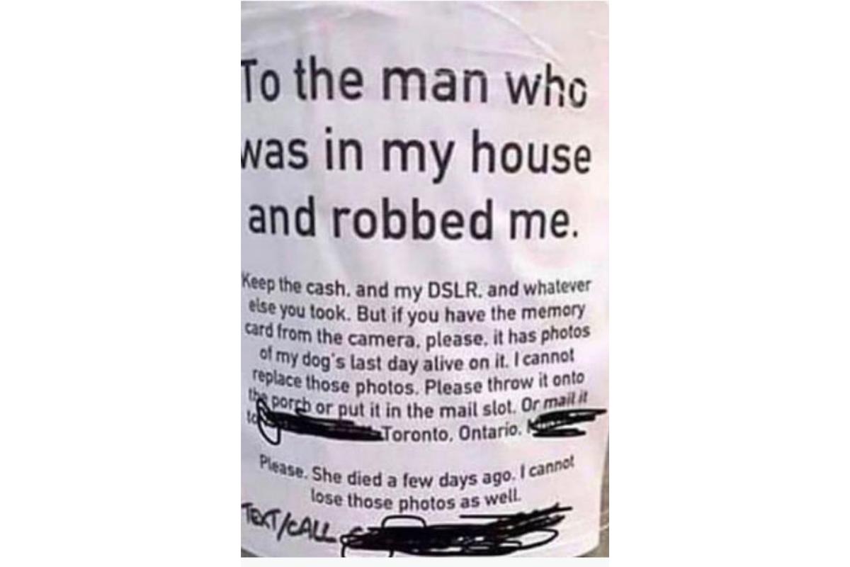 Foi em Toronto, no Canadá, que a empatia viralizou na internet. Isso porque uma vítima de roubo fez um humilde pedido para o invasor de sua residência, em um bilhete emocionante colado nos postes da rua do ocorrido. E, no recado, a vítima faz um pedido inesperado: