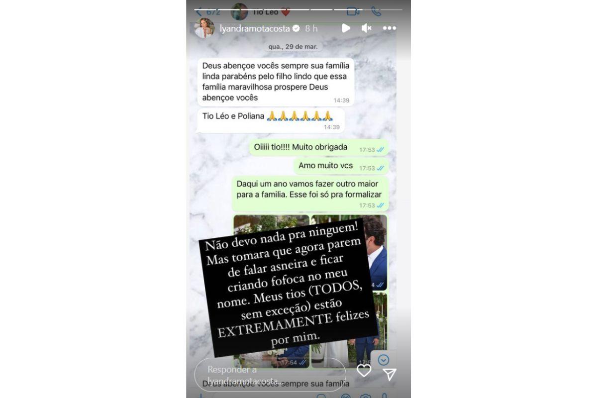 Recentemente Lyandra publicou em seu perfil no Instagram um print de sua conversa com o tio, Leonardo, após receber muitas críticas por não ter o convidado para seu casamento com Lucas Santos.
