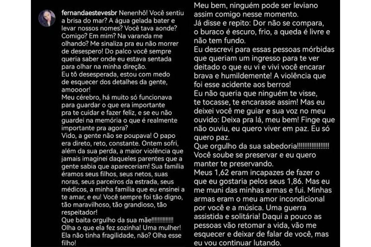 Fernanda ainda criticou a presença de parte da família do cantor no velório, que aconteceu nesta quarta, dia 23 de novembro, que lembrou da mãe dele. “Vido, a gente não se poupava! O papo era direto, reto, constante. Ontem sofri, além da sua perda, a maior violência que jamais imaginei daqueles parentes que a gente sabia que apareceriam! Sua família éramos seus filhos, seus netos, suas noras, seus parceiros da estrada, seus médicos, a minha família que eu ensinei a te amar, e eu! Você sempre foi tão digno, tão maravilhoso, tão grandioso, tão respeitador!”, disse.