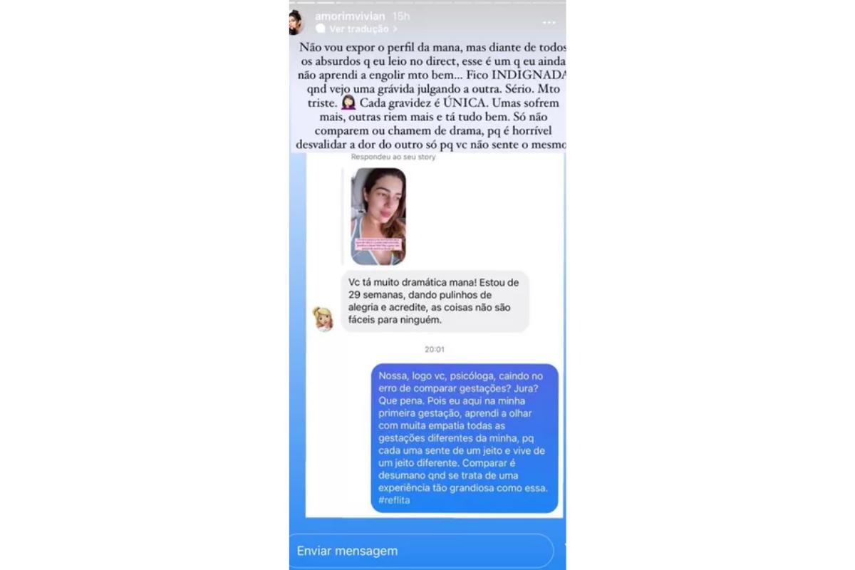 Foi através dos stories do Instagram que a ex-BBB compartilhou o relato. Para isso, Vivian Amorim publicou um print de uma das mensagens que recebeu de uma seguidora, que a chamou de “dramática” durante a gestação. Confira a mensagem abaixo.