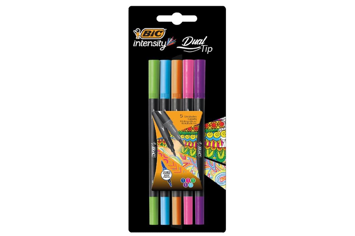 Acompanhada de um blister com 5 unidades, vem em cores variadas, e cada uma delas traz duas pontas, uma média e outra pincel, sendo prática e perfeita para quem também pratica lettering.