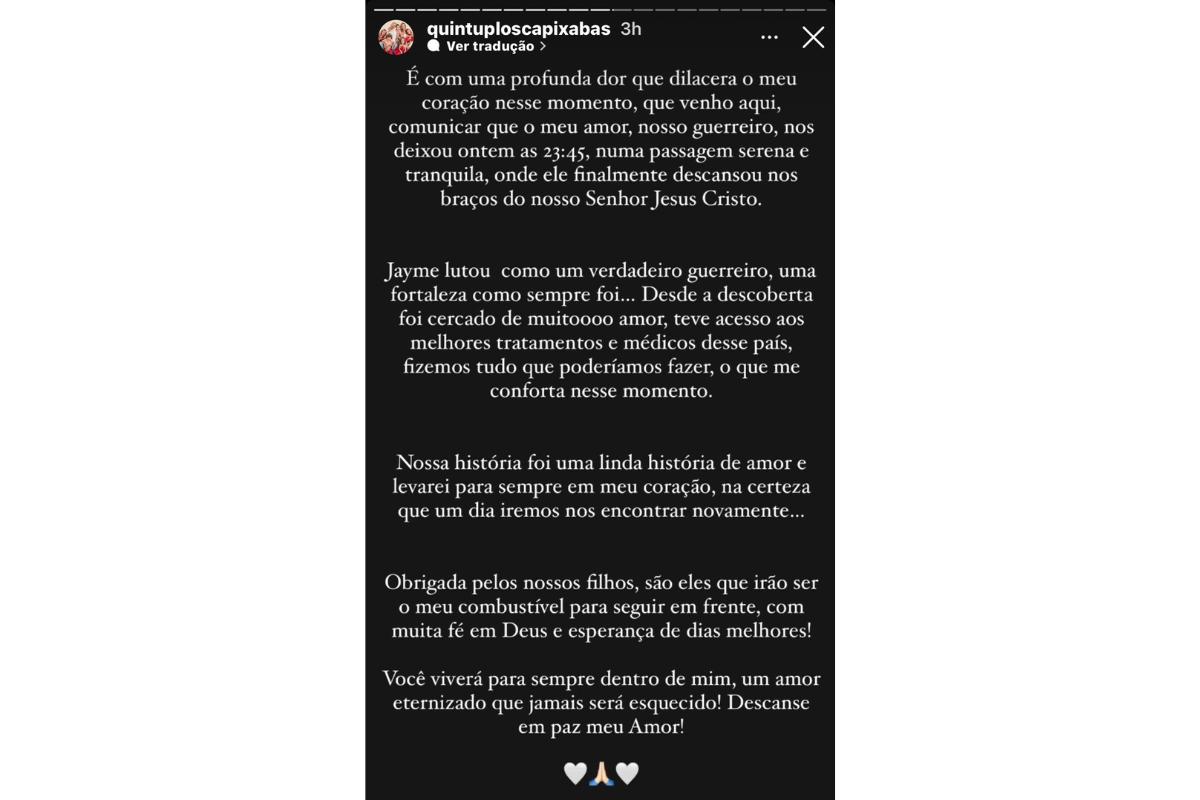 Segundo Mariana, Jayme “lutou como um verdadeiro guerreiro, uma fortaleza como sempre foi”. “Desde a descoberta foi cercado de muitoooo amor, teve acesso aos melhores tratamentos e médicos dessa país, fizemos tudo que poderíamos fazer, o que me conforta nesse momento”, disse ela quando anunciou a morte do marido.