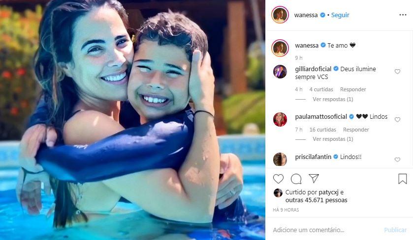 “Te amo”, declarou a cantora na legenda da publicação. Na foto, Wanessa está com o filho mais velho José Marcus, de 8 anos, na piscina e ambos estão se abraçando. Além de José Marcus, Wanessa também é mãe de João Francisco, de 5 anos. Ambos são frutos de seu casamento com o empresário Marcus Buaiz.