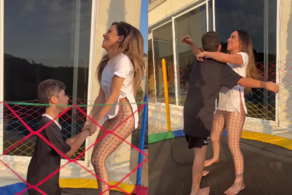 Ao ver a cama elástica gigante em sua casa, o filho abriu um sorriso largo e logo foi brincar com a mãe, como mostra o vídeo publicado por Wanessa nas redes sociais. “As crianças aqui adoram pula-pula! Até eu entro na brincadeira”, disse ela na legenda do post.