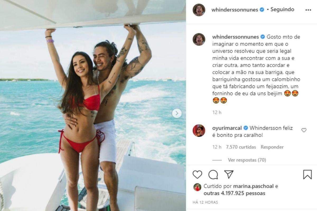 Junto com a imagem, Whindersson falou um pouco sobre a espera pelo primeiro filho do casal, que anunciou a gravidez no início de janeiro. “Gosto muito de imaginar o momento em que o universo resolveu que seria legal minha vida encontrar com a sua e criar outra”, começou ele escrevendo.