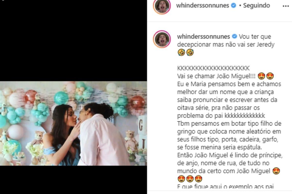 Em um post com uma montagem com vários momentos do chá revelação, Whindersson Nunes brincou sobre a escolha, mandando até uma indireta a os pais. “Vou ter que decepcionar, mas não vai ser Jeredy. Vai se chamar João Miguel! Eu e Maria pensamos bem e achamos melhor dar um nome que a criança saiba pronunciar e escrever antes da oitava série, pra não passar os problema do pai”, brincou.