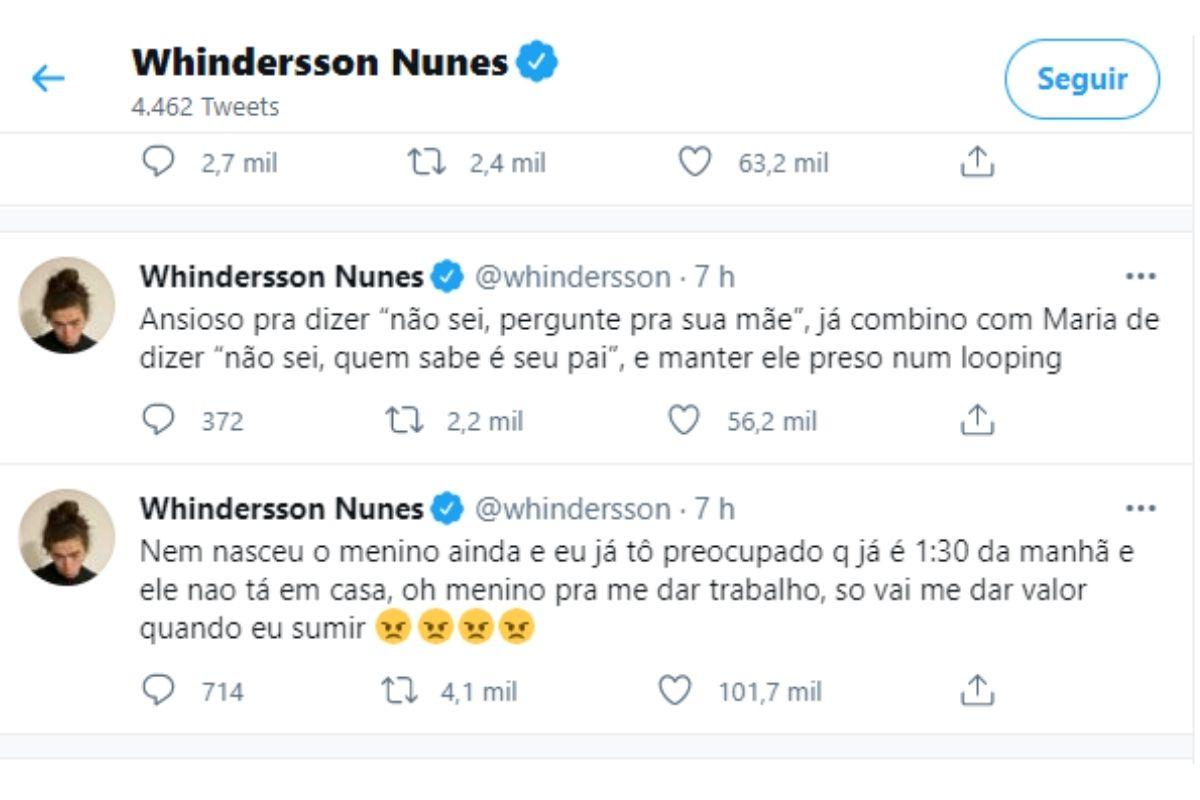 Na tarde do último sábado, Whindersson Nunes, de 26 anos, e Maria Lina Deggan, de 22, anunciaram que esperam um menino. O chá revelação foi realizado com a família do casal e ambos deram a notícia nas redes sociais. Após o anúncio, o influenciador usou o Twitter para mostrar a ansiedade sobre a paternidade.