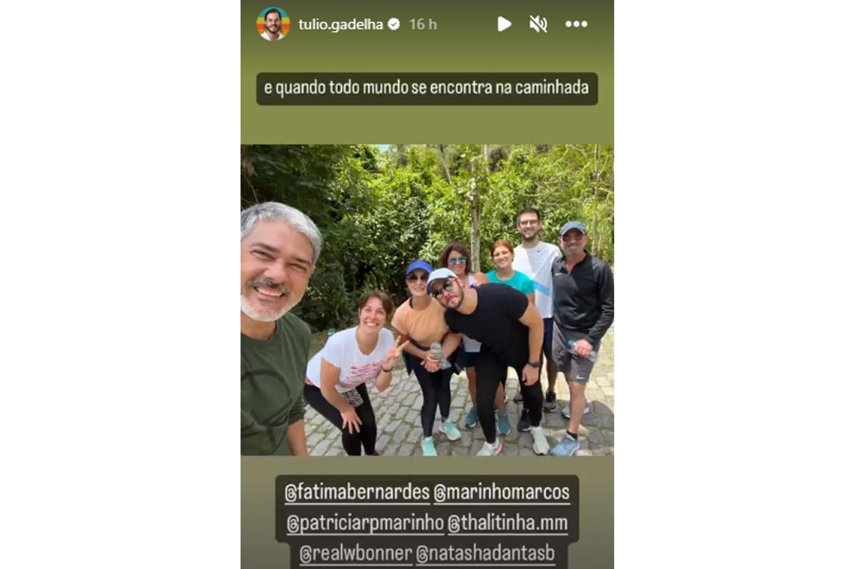 Os jornalistas William Bonner, de 58 anos e Fátima Bernardes, de 60, que foram casados por 26 anos, acabaram se reencontrando durante uma caminhada em família. O registro compartilhado pelo atual parceiro da apresentadora, Túlio Gadêlha, mostra também a atual companheira do âncora, Natasha Dantas, além de alguns amigos e o filho do casal, Vinícius Bonner, de 25 anos, ao surgirem se exercitando juntos.
