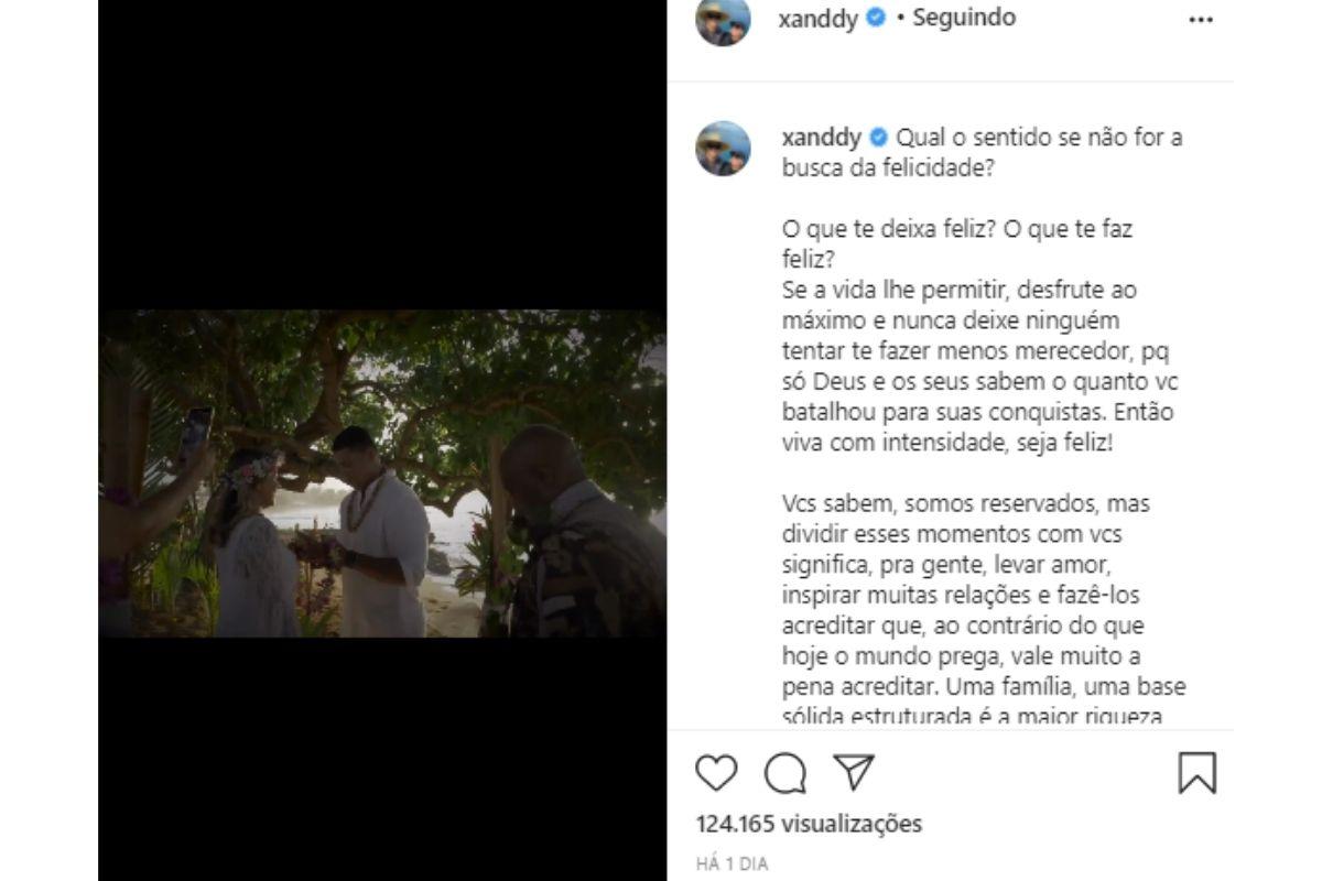 Para finalizar, Xanddy falou sobre o relacionamento com a esposa. “Eu e a Carla estamos juntos há 21 anos, já superamos muitos obstáculos e possivelmente vão existir outros para superarmos, mas Jesus nos traz paz, confiança, segurança, aumentando ainda mais a convicção do que queremos, e o que queremos é ficar velhinhos juntos, na Liberdade em SSA onde nascemos, ou no Havaí, um cuidando do outro. Vamos continuar por aqui curtindo os nossos dias, pq como disse lá no início do texto: Nos sentimos merecedores. Esses dias estamos melosos mesmo tá, gente!? Não se incomodem pq isso é AMOR, AMOR, AMOR FELICIDADE”, finalizou, agradecendo à Deus.