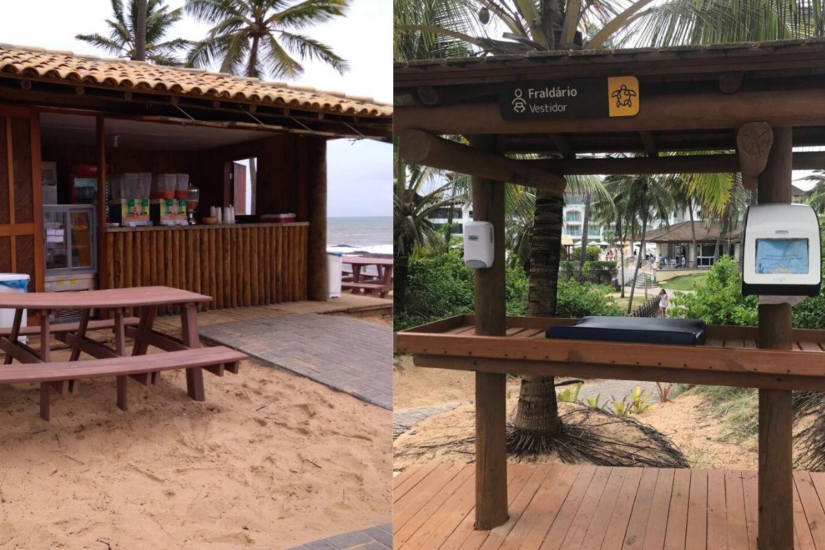 Uma das nossas partes preferidas foi poder conhecer o projeto Tamar e ver as tartarugas de pertinho! Na praia da Soltura, que fica dentro do complexo, é uma área de desova, então as famílias podem se juntar e acompanhar o trajeto dos filhotes até o mar pela primeira vez. Sério, a experiência é emocionante! De noite, todas as luzes ficam apagadas para que elas consigam ir até o oceano sozinhas, sem nenhuma interferência artificial, apenas guiadas pela luz das estrelas e da lua, e também pelo barulho das ondas.