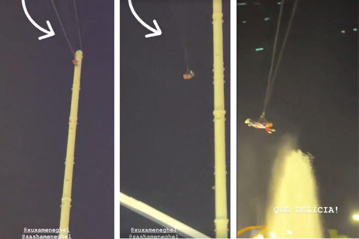 Xuxa, Sasha, João Figueiredo, Junno Andrade e Bruna Marquezine estão curtindo dias de férias em Orlando, nos Estados Unidos. Durante as férias, a apresentadora e a filha decidiram se aventurar juntas em um brinquedo radical de um parque temático. No Universal Studios, as duas curtiram uma atração tipo pêndulo chamada Skycoaster, e foram arremessadas de uma grande altura.