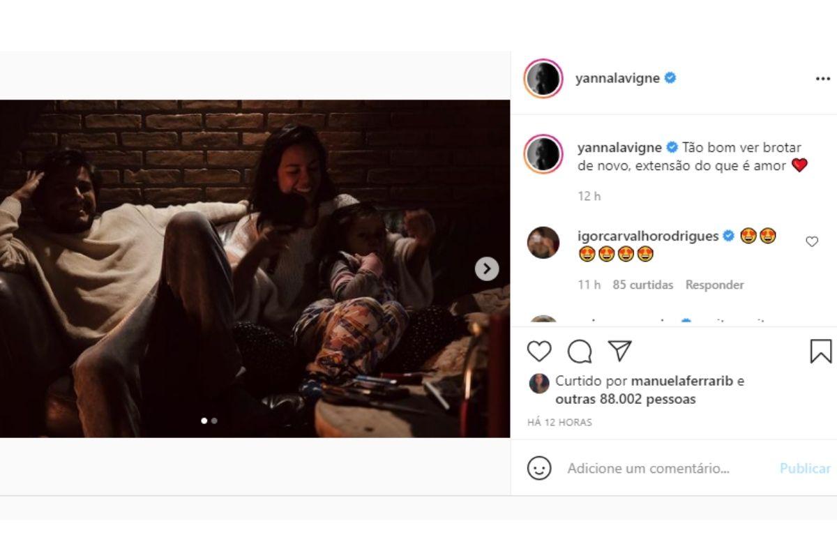 Depois que a notícia se espalhou nas redes sociais, Yanna decidiu falar sobre o assunto no Instagram. Para isso, compartilhou uma foto ao lado do marido e do primeiro filho do casal, Madalena, de 4 anos. “Tão bom ver brotar de novo, extensão do que é amor”, escreveu ela ao compartilhar o momento.