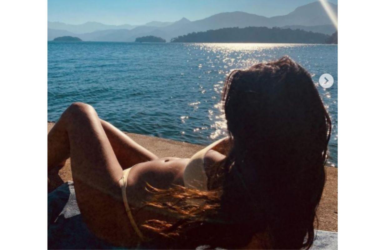 Desde então, a atriz tem publicado fotos e registros da gravidez. Desta vez, a atriz compartilhou com os fãs uma foto curtindo o sol de biquíni. “A vida não tá só sol e mar, mas feed é feed… (por enquanto)”, falou ela ao exibir o tamanho da barriga.