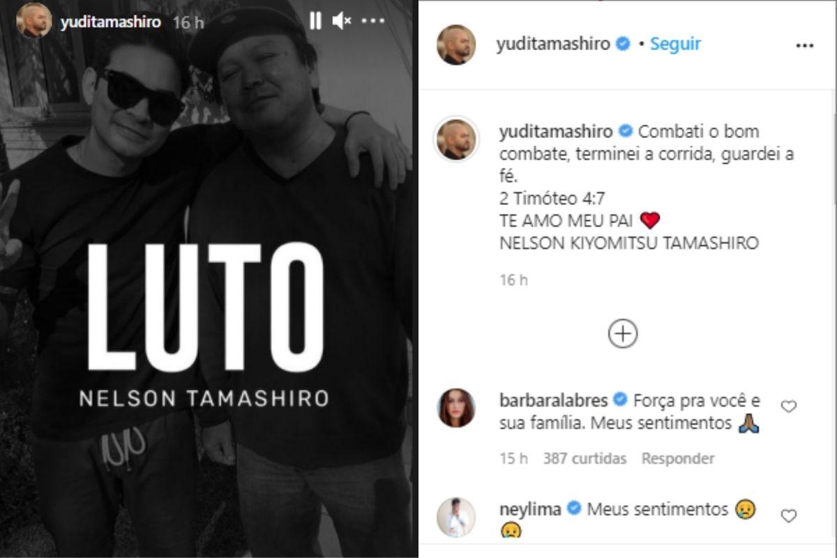 “‘Combati o bom combate, terminei a corrida, guardei a fé’. 2 Timóteo 4:7. Te amo, meu pai, Nelson Kyomitsu Tamashiro”, escreveu Yudi na legenda. Pouco antes, o cantor publicou uma imagem dos dois em preto e branco, com a palavra “luto” em destaque.