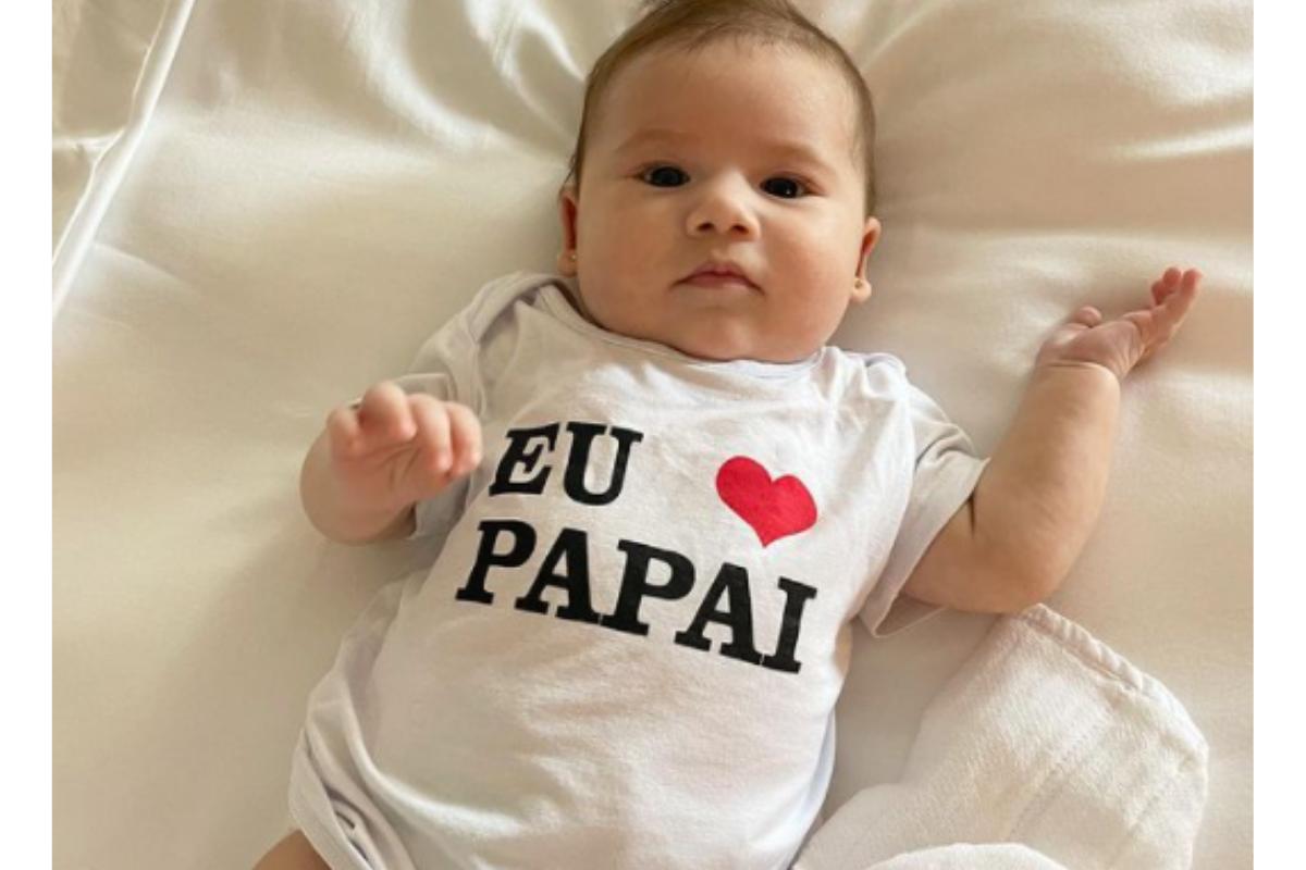 Na imagem, a menina aparece deitada na cama com um body com os dizeres: “Eu amo papai”. O cantor não perdeu tempo e compartilhou o momento com os fãs: “O papai morre de amor”, escreveu o marido de Virgínia na legenda da publicação