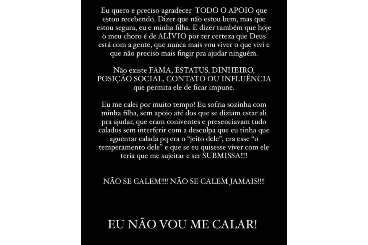 “Não existe fama, status, dinheiro, posição social, contato ou influência que permita ele de ficar impune. Eu me calei por muito tempo. Eu sofria sozinha com minha filha, sem apoio até dos que diziam estar ali para ajudar, que eram coniventes e presenciaram tudo calados, sem interferir, com a desculpa de que eu tinha que aguentar calada”, comentou. “Por mim e por você, minha filha. Que sentia junto comigo, antes de nascer, a angústia e o medo. Estamos salvas”, também escreveu, em novo post, sobre a denúncia feita contra o agressor.