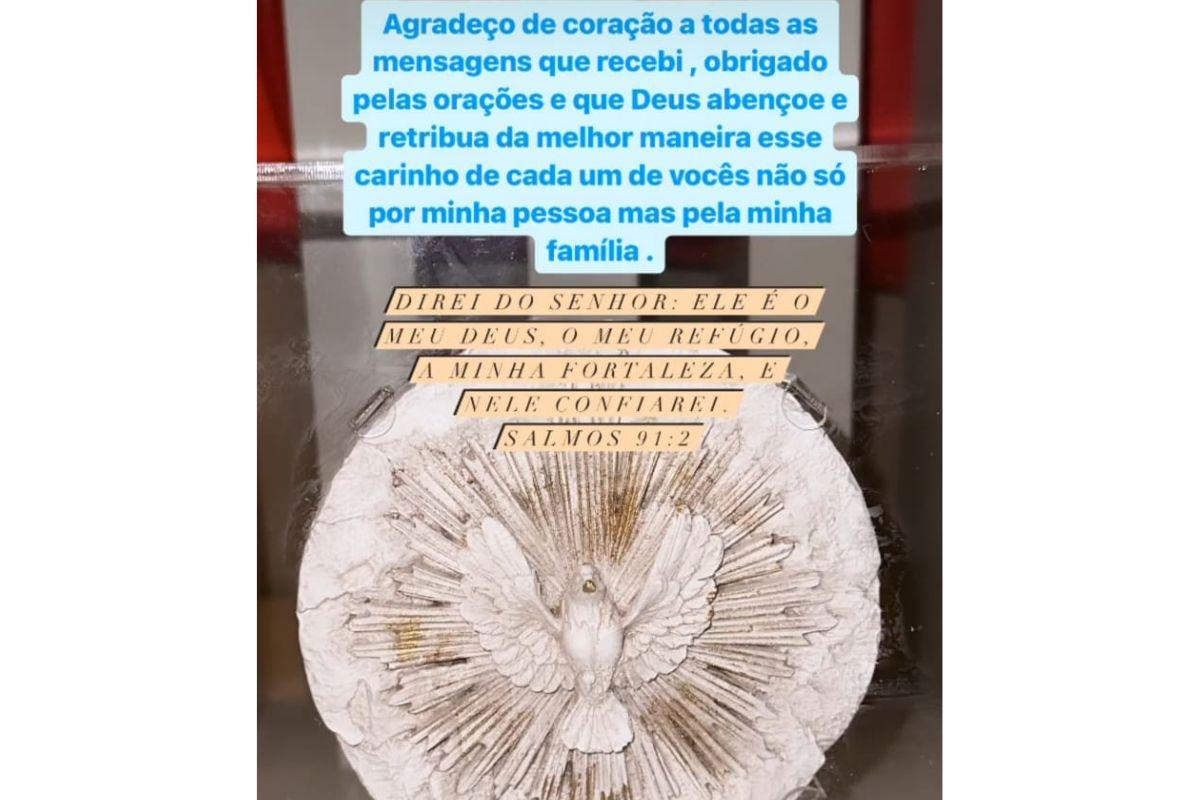 No Stories, Zé Vaqueiro escreveu: “Agradeço de coração a todas as mensagens que recebi, obrigado pelas orações e que Deus abençoe e retribua da melhor maneira esse carinho de cada um de vocês, não só por minha pessoas mas pela minha família. ‘Direi do Senhor: Ele é o meu Deus, o meu refúgio, a minha fortaleza, e nele confiarei’. Salmos 9:12”.