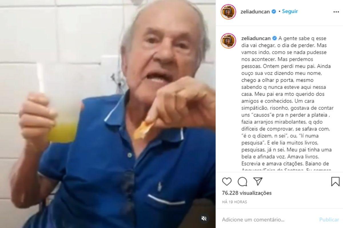 No vídeo, Seu Antônio aparece de bom-humor convidando Zélia para tomar “garapa com pastel”. “A gente sabe que esse dia vai chegar, o dia de perder. Mas vamos indo, como se nada pudesse nos acontecer. Mas perdemos pessoas. Ontem perdi meu pai. Ainda ouço sua voz dizendo meu nome, chego a olhar para a porta, mesmo sabendo que nunca esteve aqui nessa casa”, escreveu a artista na legenda.