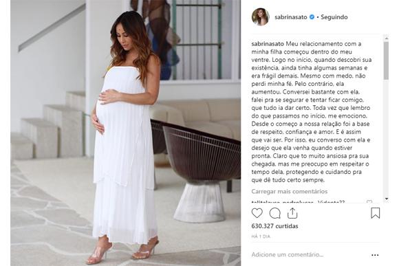Sabrina abriu o coração e revelou que deu muito medo de perder a filha, mas que não perdeu a fé. “Em nenhum momento eu pensei que daria errado, sempre acreditei que iria das certo. Sempre consegui visualizar a gestação e que ia acontecer”, comentou. Recentemente a paulista publicou uma foto no seu perfil do Instagram, com mais de 16 milhões de seguidores, comentando sobre a ansiedade da espera pelo nascimento do bebê.