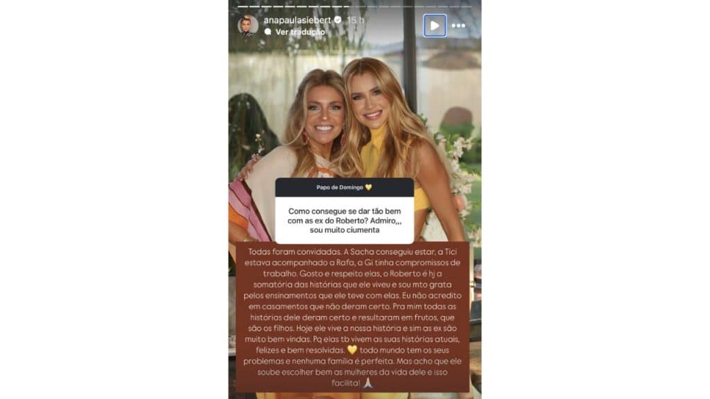 Quando questionada sobre o que faz para se dar bem com as ex-esposas de Roberto Justus, Ana Paula foi clara: “Gosto e respeito elas. O Roberto é hoje a somatória das histórias que ele viveu e sou muito grata pelos ensinamentos que ele teve com elas.” Segundo ela, a convivência entre todos é algo natural, pois, para ela, não há o que classificar como casamentos “que não deram certo”. “Eu não acredito em casamentos que não deram certo. Para mim, todas as histórias dele deram certo e resultaram em frutos, que são os filhos”, disse, destacando que os filhos das uniões anteriores são fundamentais para o seu relacionamento com Roberto.