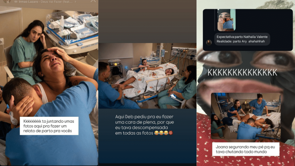 A influenciadora revelou que o nervosismo durante o parto foi tanto que chegou a “chutar” pessoas ao seu redor. Apenas um clique conseguiu registrar uma expressão mais tranquila. “Joana segurando meu pé porque eu estava chutando todo mundo. Aqui a Deb pediu para eu fazer uma cara de plena porque eu estava descompensada em todas as fotos”, explicou.