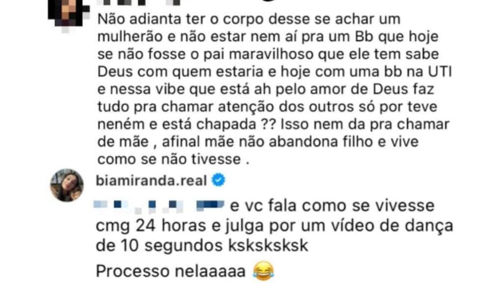 “Não adianta ter o corpo que tem, se achar um mulherão e não estar nem aí para um bebê que, se não fosse o pai maravilhoso, sabe Deus com quem estaria”, disparou a seguidora. A crítica ainda foi além, mencionando Maysha, filha recém-nascida de Bia, que está internada na UTI neonatal após nascer prematura.