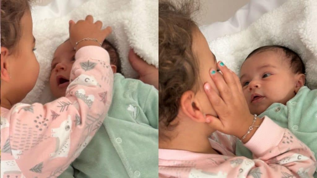 Nos registros divulgados no Instagram, Mavie aparece admirando a irmãzinha. Em uma das imagens, a pequena observa Mel atentamente com a mão apoiada no rosto. Em outro clique, ela acaricia delicadamente a bebê, demonstrando o vínculo especial que já começa a se formar entre as irmãs.
