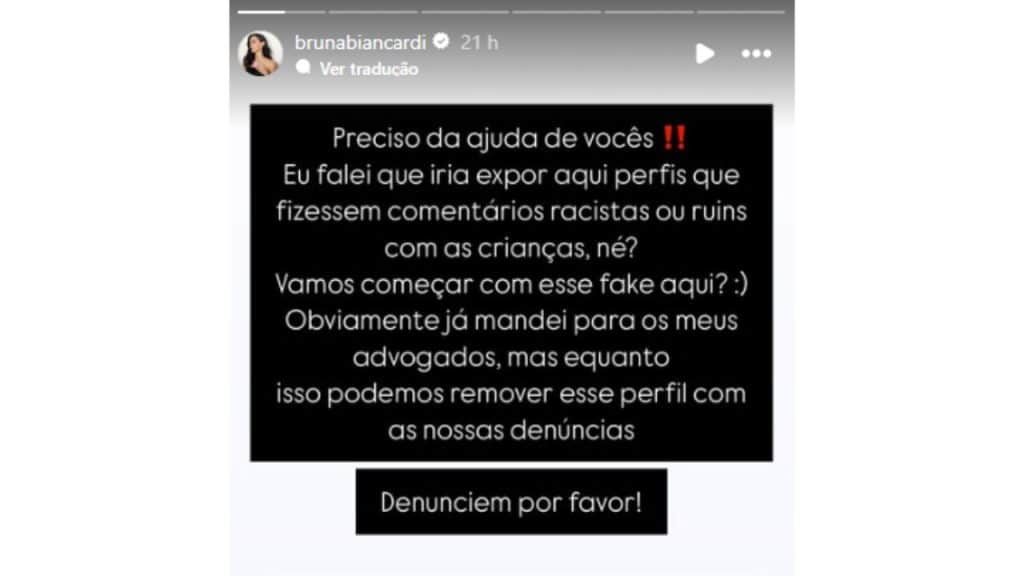 Bruna compartilhou em seus stories do Instagram: “Preciso da ajuda de vocês! Eu falei que iria expor aqui perfis que fizessem comentários racistas ou ruins com as crianças, né? Vamos começar com esse fake aqui?”. De forma clara e direta, ela pediu para que os seguidores denunciassem o perfil de uma mulher que estava atacando não só a sua filha, mas também a pequena Helena, irmã de Mavie e filha da influenciadora Amanda Kimberlly, ambos frutos de relações diferentes do jogador Neymar.